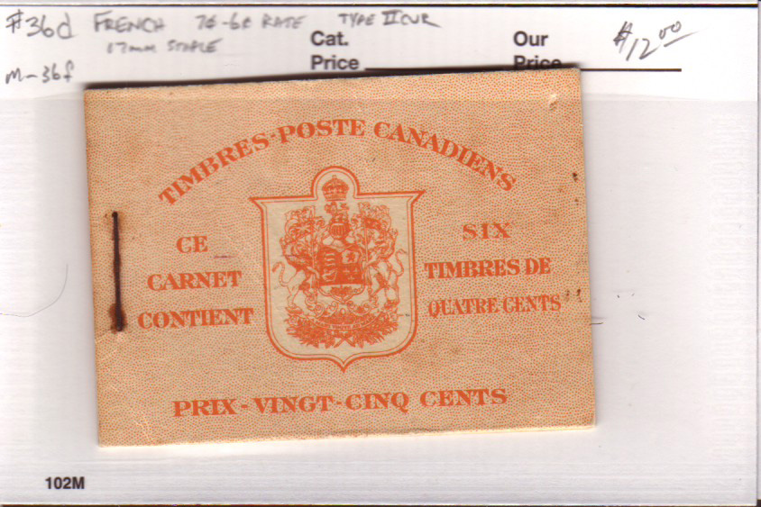 36d - KGVI War Issue 4¢ carmine - French - 17mm staple - type II cover 7¢ /6¢ rate (McCann #36f) $12.00 - new