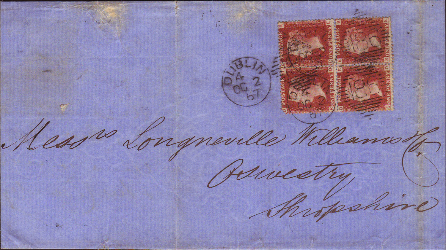Great Britain 1884 SC#67 Plate #13 on cover used in Ireland - from Naas, Ireland AUG 11/84 To Most Reverend James Carbery Hamilton, Ontario Canada - reverse shows Hamilton receiving cancel AUG 22/84